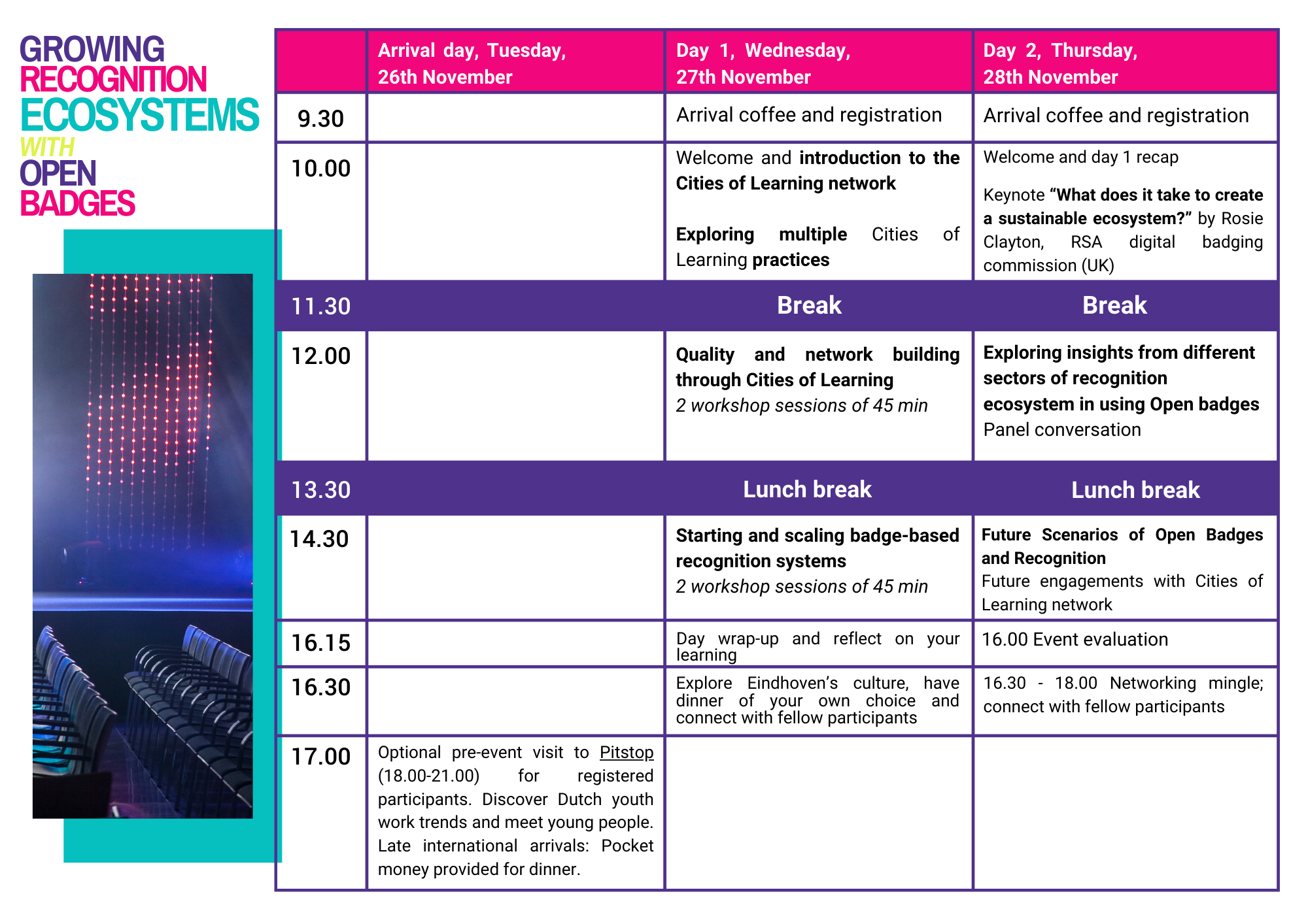 • Gain insights about what is meaningful and connect with best practices for recognising and validating non-formal learning with digital Open Badges and Cities of Learning platforms. Professionals using Cities of Learning as platform and issuing Open Badges will share their expertise. People from Belgium, Curaçao, Germany, Greece, Hungary, Italy, Lithuania, the Netherlands, Romania, Slovenia, Spain, Portugal, Serbia, Cyprus, Nigeria, South Africa, Moldova, Belarus, UK and Armenia will be present.