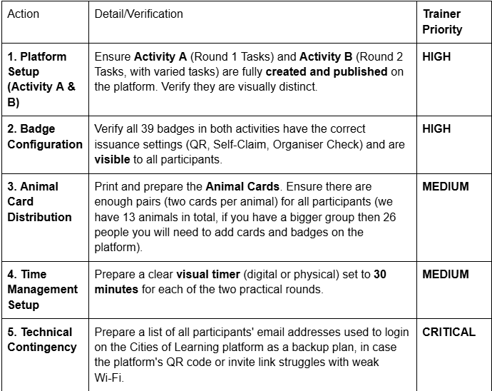 This guide provides the operational steps for running the 1 hour 30 minute "Issuer Mission: The Operational Challenge" session. This session uses universal tasks to simulate the three core badge issuance methods: QR Code, Peer Check, and Organiser Check.