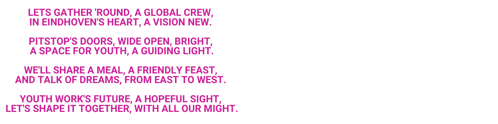 Pitstop creates a safe space where young people feel heard and can be themselves. We believe in a collaborative approach involving the community, residents, organizations, and young people themselves to make a significant impact on the lives of young people in Eindhoven.